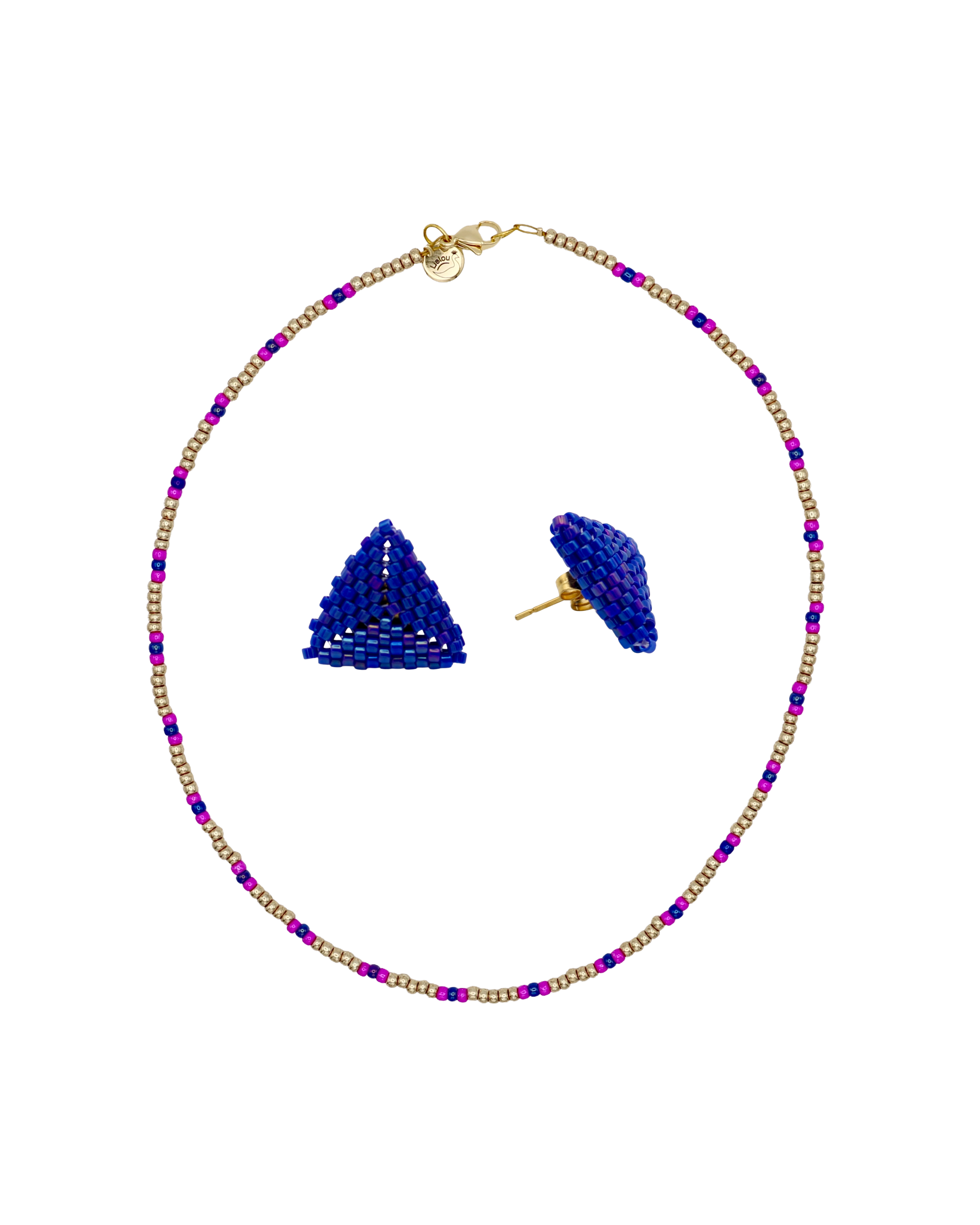This handcrafted set features the cobalt triangle stud earrings and the gold, magenta, cobalt Miyuki bead necklace – two unique pieces that complement each other perfectly.