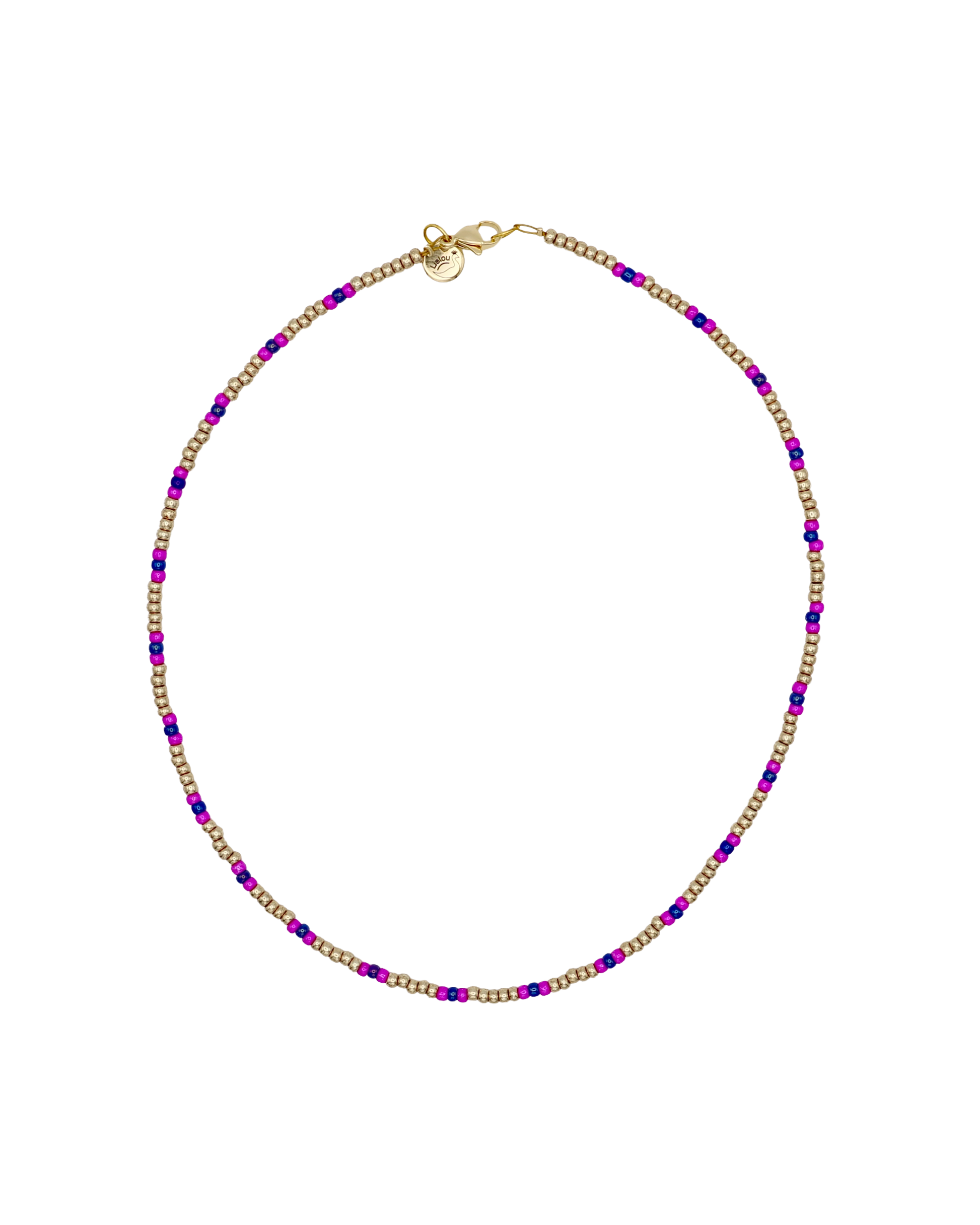 This handmade Miyuki beaded necklace combines gold, magenta, and cobalt—a vibrant mix of colors that creates a bold and playful accent. At 42 cm long, it's ideal for layering with longer pieces or wearing it subtly solo. The delicate Miyuki beads add a refined sheen and sit lightly around the neck. The colors perfectly complement the Gouden Kever collection, but also add a cheerful touch to your outfit on their own.