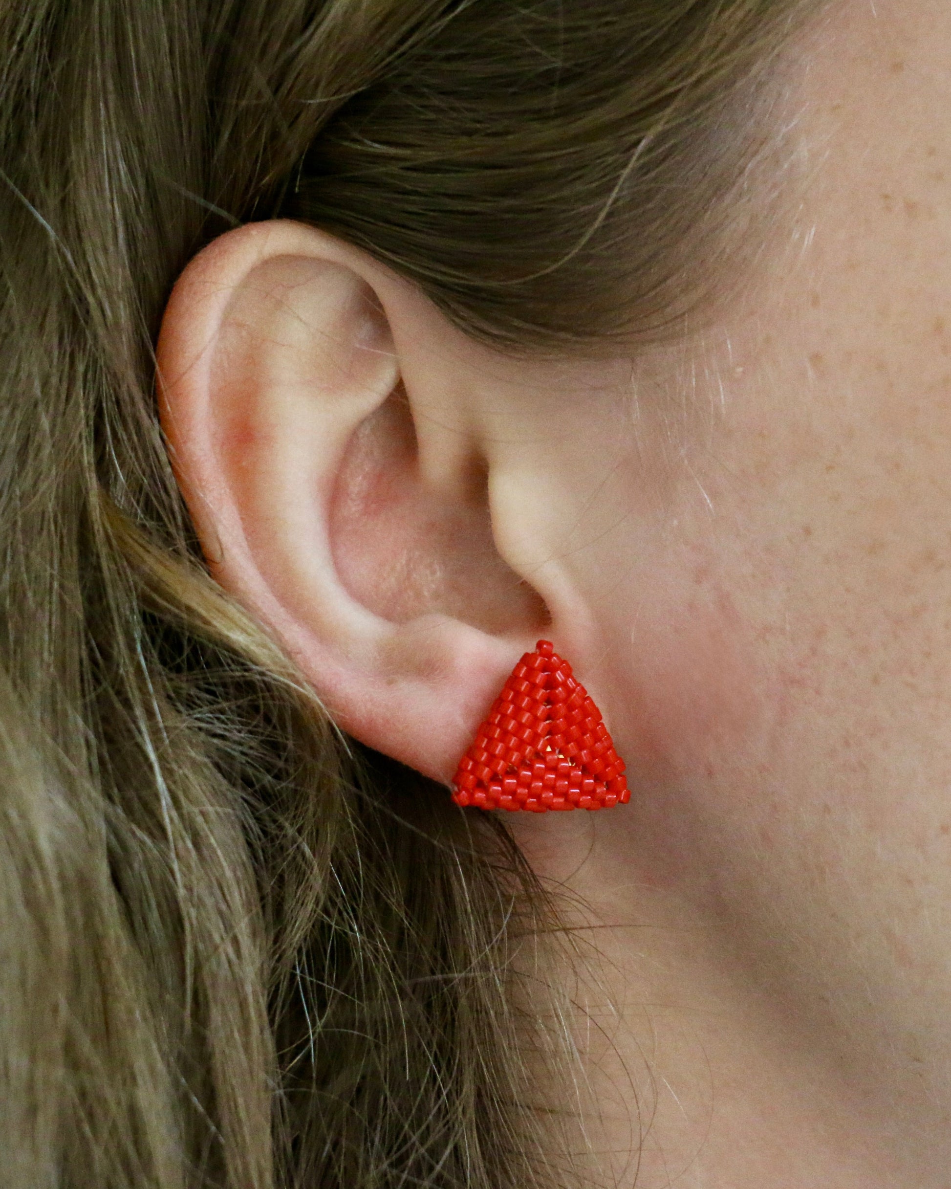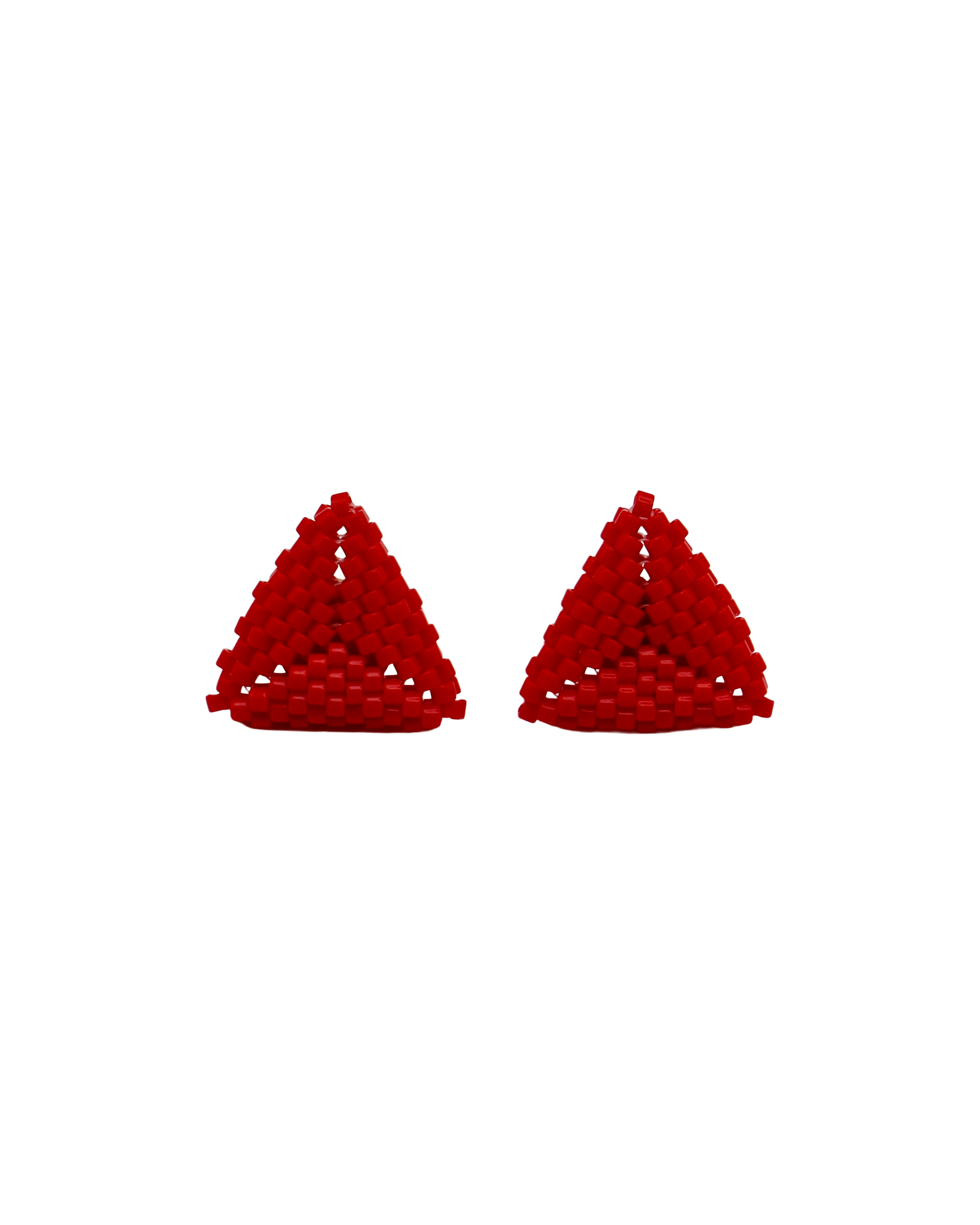 These handmade triangle stud earrings are a refined addition to your jewelry collection. Crafted with delicate red Miyuki Delica beads and finished with a stainless steel stud, they are lightweight, comfortable, and stylish. The warm, rich shades complement the Ladybug collection beautifully, making these earrings a playful and elegant detail—whether worn solo or paired with a matching piece. The studs have a diameter of 1.7 cm and are handcrafted—each pair is unique and carefully crafted.
