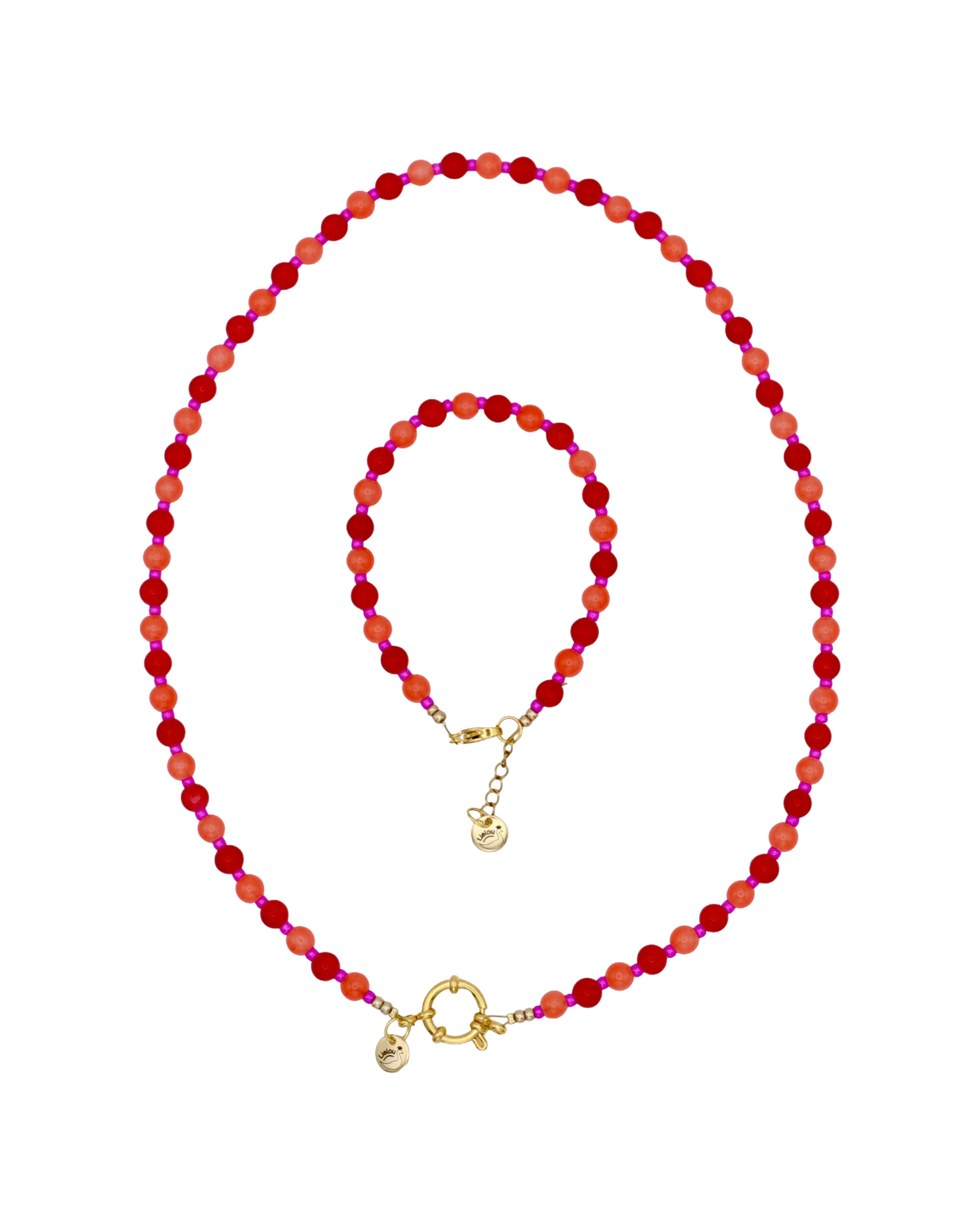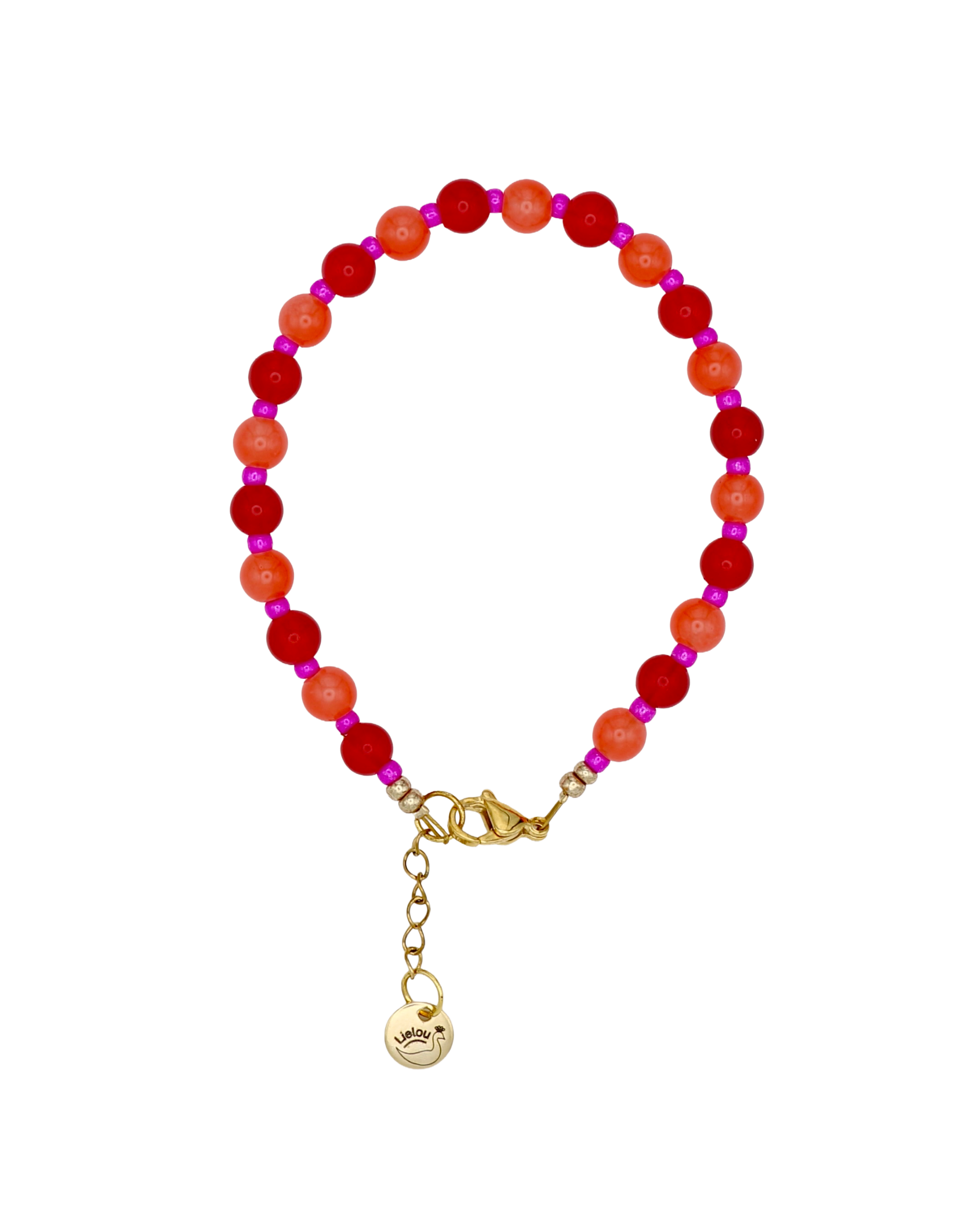 This handmade beaded bracelet combines glass beads and delicate Miyuki beads in warm, vibrant colors: red, coral, and magenta. The bracelet is approximately 19 cm long and includes a 2.5 cm extension chain for a perfect fit. Finished with an elegant gold-tone stainless steel lobster clasp, this bracelet is a stylish and playful accessory that perfectly complements the matching beaded necklace in the same colors. Carefully handcrafted, unique, and made of high-quality materials.