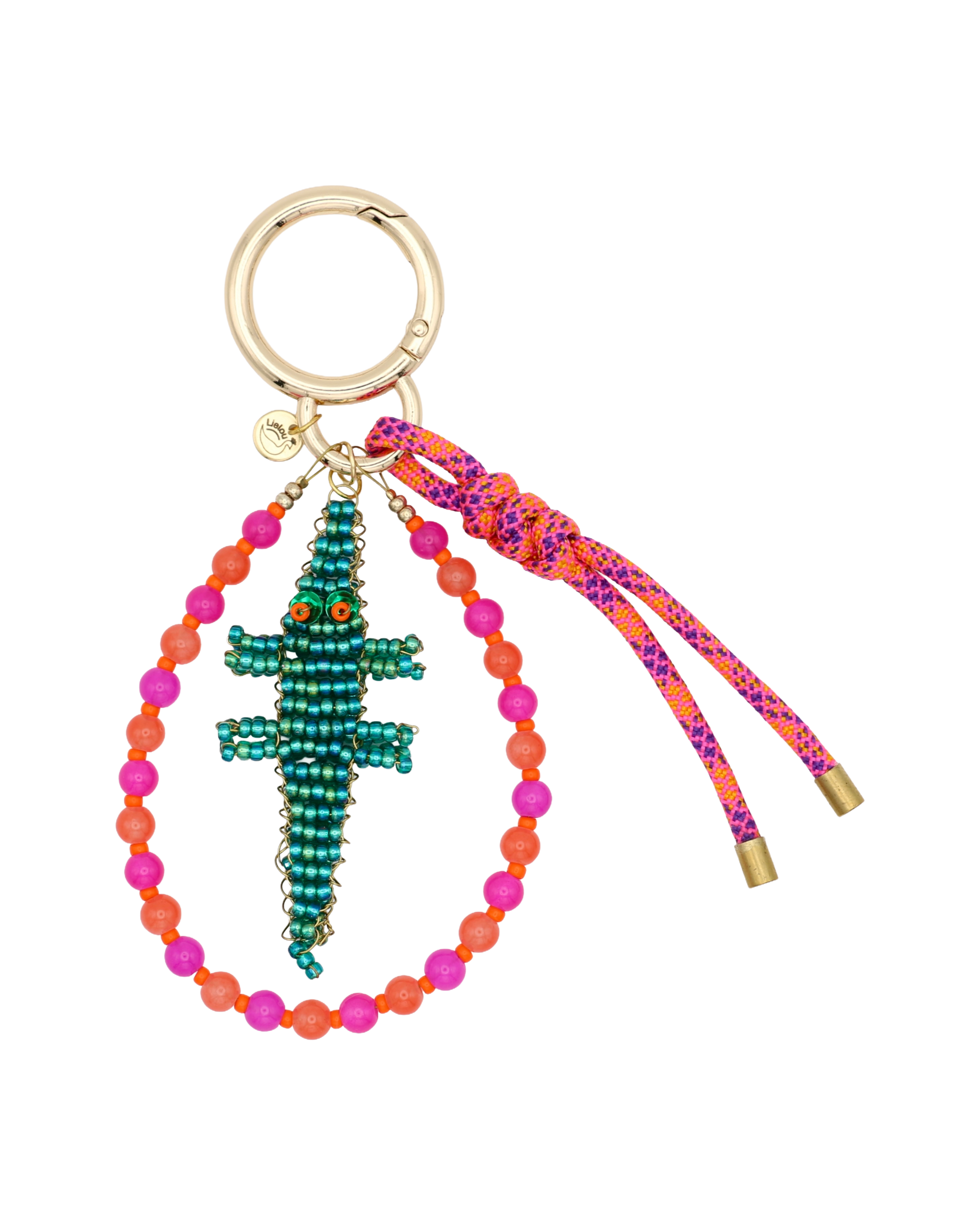 This handmade Emerald Crocodile is now also available as a bag charm—a playful, colorful detail for your bag. Crafted from high-quality Miyuki beads and copper wire, the crocodile hangs from a gold-colored keyring with a knotted paracord in shades of pink and purple. The bag charm is finished with a mix of glass beads and Miyuki beads in pink, coral, and orange—a striking combination that immediately catches the eye.