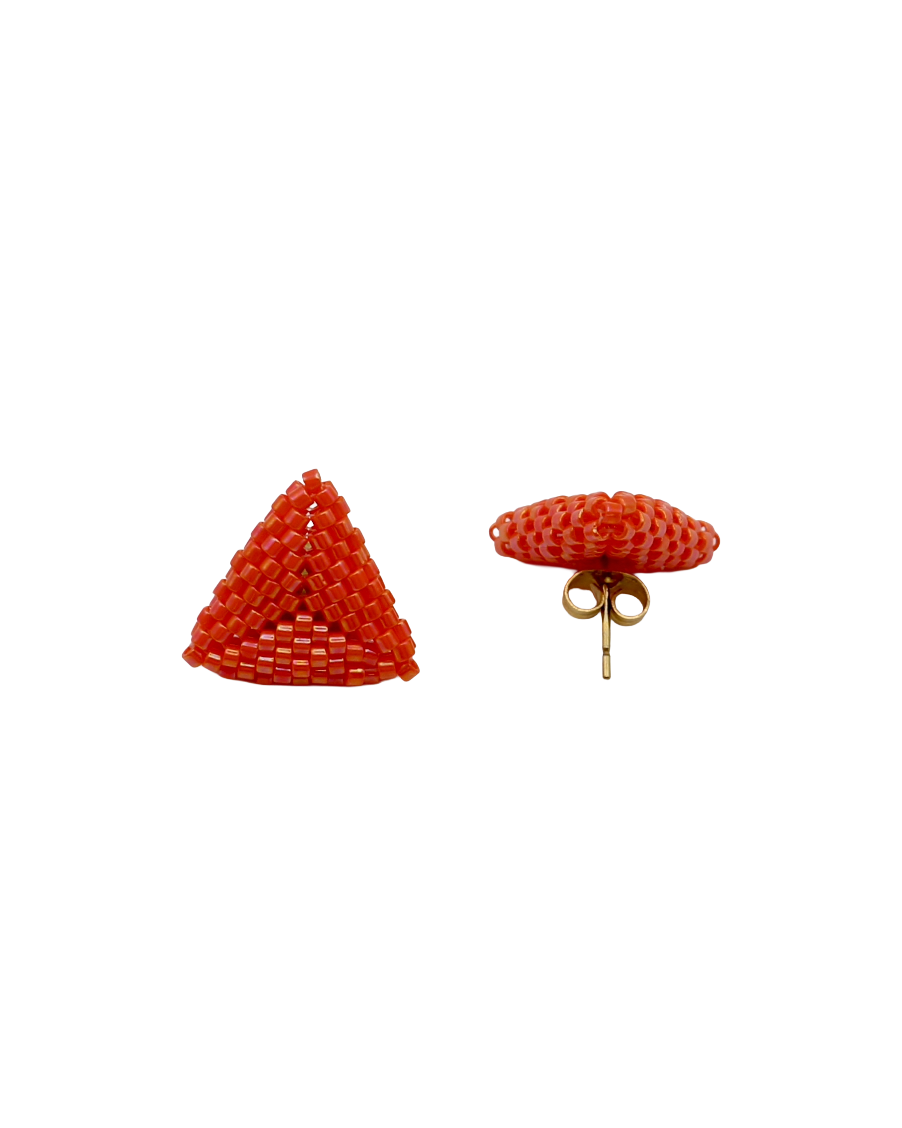 These handmade triangle stud earrings are a refined addition to your jewelry collection. Crafted with delicate Miyuki Delica beads in a shimmering orange and finished with a stainless steel stud, they are lightweight, comfortable, and stylish. The warm, rich shades complement the Ladybug collection beautifully, making these earrings a playful and elegant addition—whether worn solo or paired with a matching piece. The studs have a diameter of 1.7 cm and are handcrafted—each pair is unique and carefully crafted.