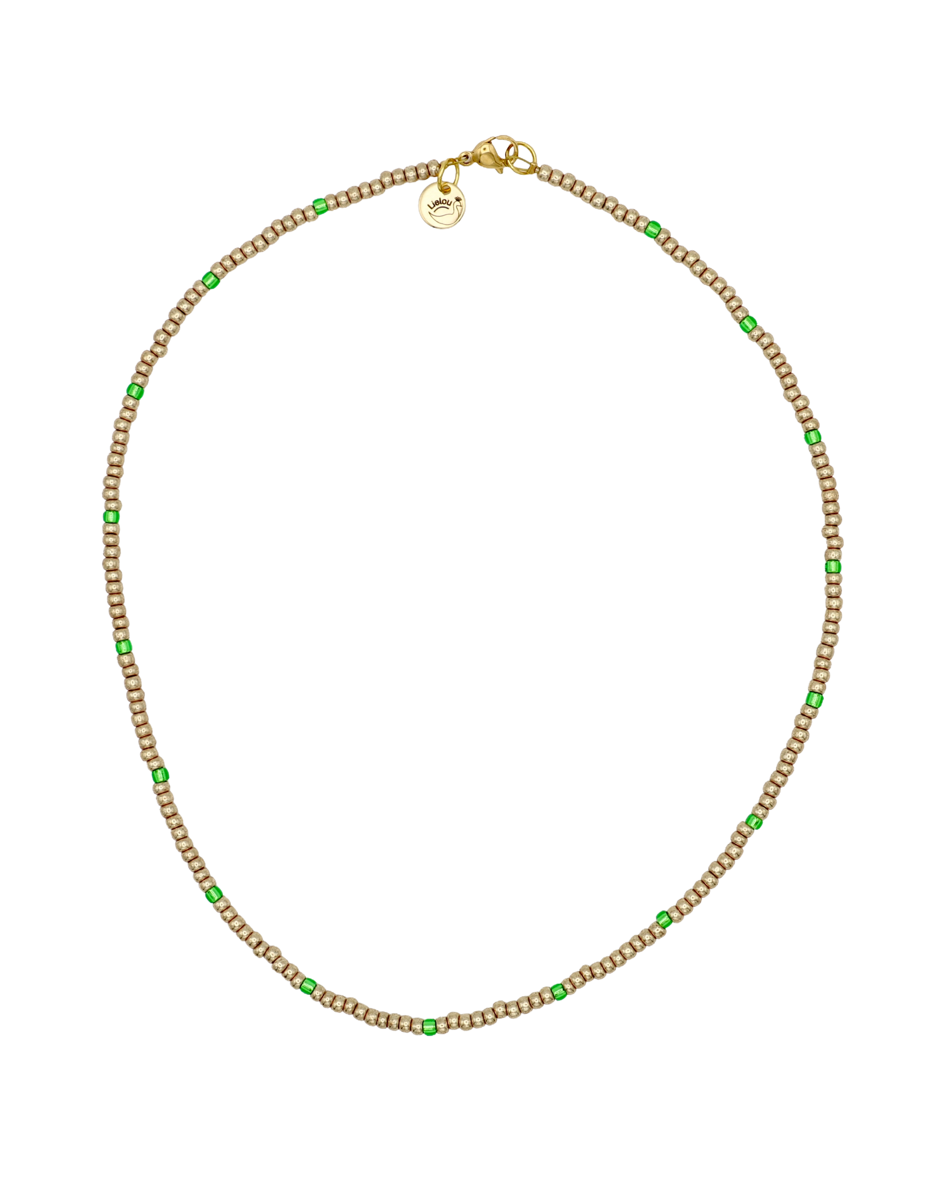Deze handgemaakte Miyuki kralenketting in goud en groen is een verfijnd en speels accessoire dat moeiteloos te combineren is. De heldere groentint en warme goudkleur vormen samen een frisse, natuurlijke combinatie die subtiel opvalt. Met een lengte van 42 cm is deze fijne ketting ideaal voor layering met langere sieraden, of als ingetogen accent op zichzelf. De kleine Miyuki kralen zorgen voor een zachte glans en een comfortabele pasvorm. De kleuren sluiten perfect aan bij de Groene Kameleon collectie, maar geven ook los gedragen een rustig kleuraccent aan je look.