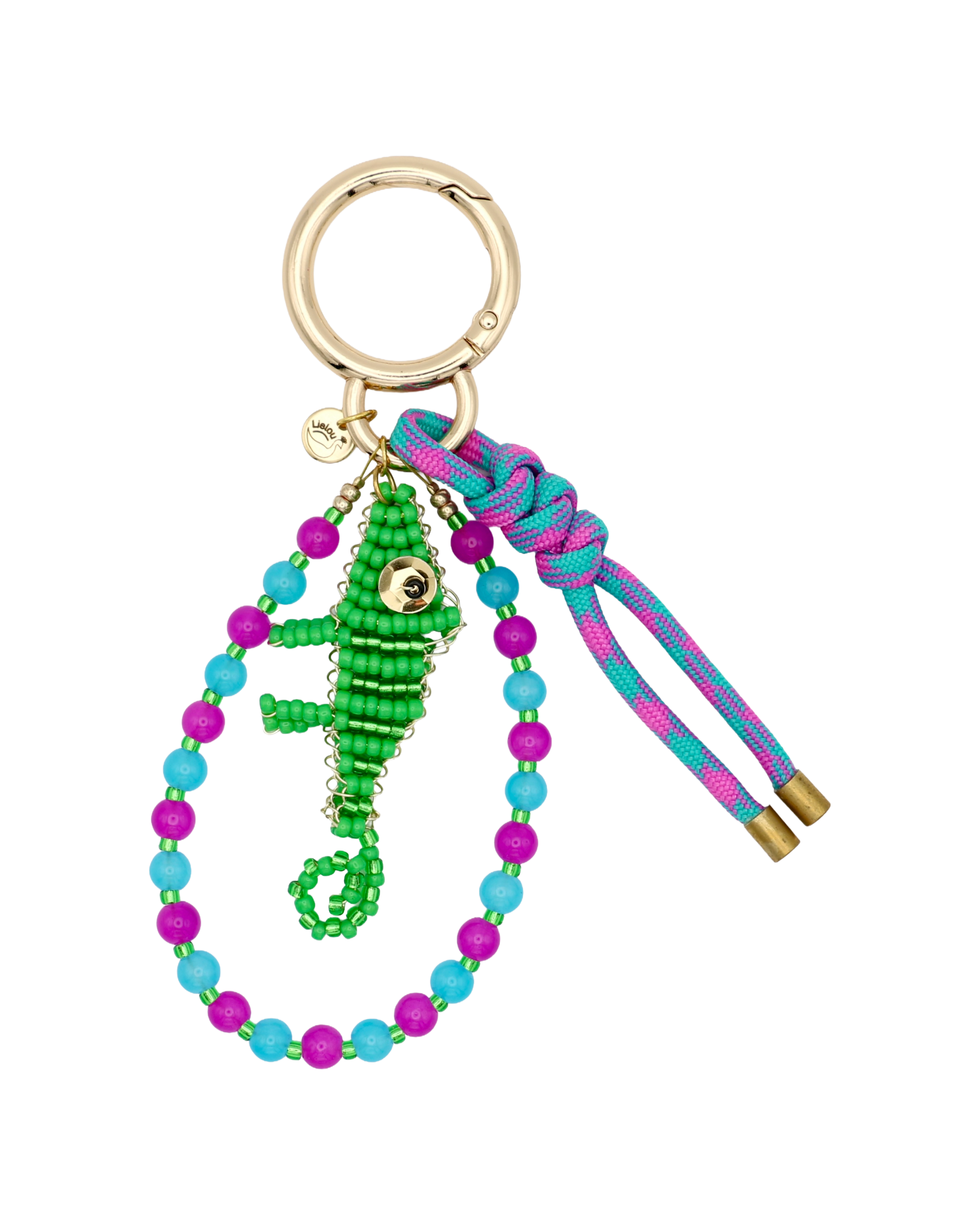Deze handgemaakte bedel in de vorm van een Groene Kameleon is nu ook verkrijgbaar als bag charm – een speels en kleurrijk detail voor aan je tas. De kameleon is zorgvuldig vervaardigd van hoogwaardige Miyuki kraaltjes en koperdraad, en hangt samen met een geknoopt paracord in groen & roze tinten aan een goudkleurige sleutelhanger. De charm is afgewerkt met een mix van glaskralen en Miyuki kraaltjes in frisse tinten van violet, blauw en groen – een levendige combinatie die direct opvalt.