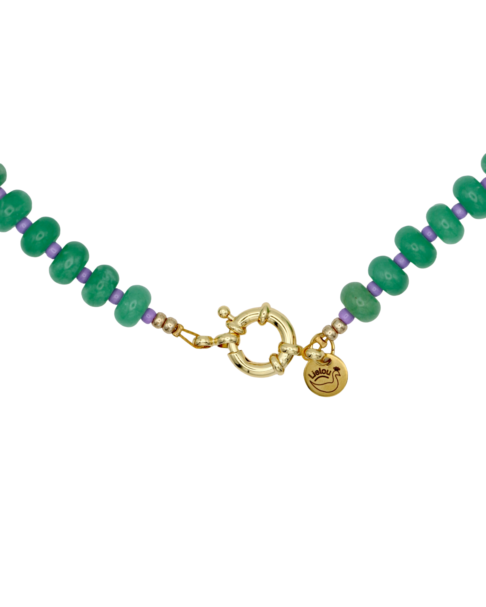 Deze handgemaakte kralenketting combineert frisse lichtgroene natuursteen rondellen met zachte lila Miyuki kralen. De subtiele balans tussen koel en warm geeft het sieraad een verfijnde, dromerige uitstraling. Met een lengte van 52 cm valt de ketting mooi op zichzelf, of vormt hij een elegant contrast in een gelaagde combinatie met andere sieraden. De 18K vergulde boeisluiting voegt een vleugje luxe toe en biedt ruimte voor een bedel — zo maak je de ketting helemaal eigen.